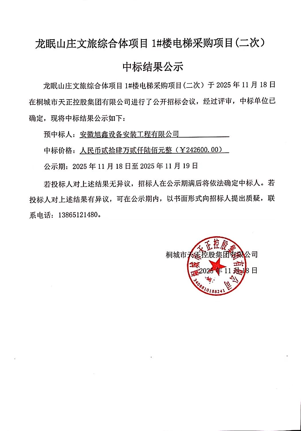 龙眠山庄文旅综合体项目1#楼电梯采购项目(二次)于2025年11月18日在桐城市天正控股集团有限公司进行了公开招标会议,经过评审,中标单位已确定,现将中标结果公示如下:
